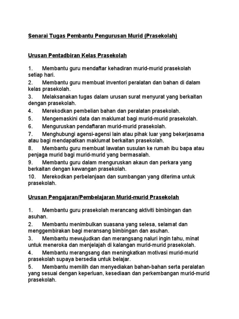 Bidang tugas bagi skim perkhidmatan pembantu pengurusan murid prasekolah 1. Membantu guru kelas prasekolah dalam hal ehwal. Sekolah/ asrama di bawah kementerian pelajaran malaysia.
