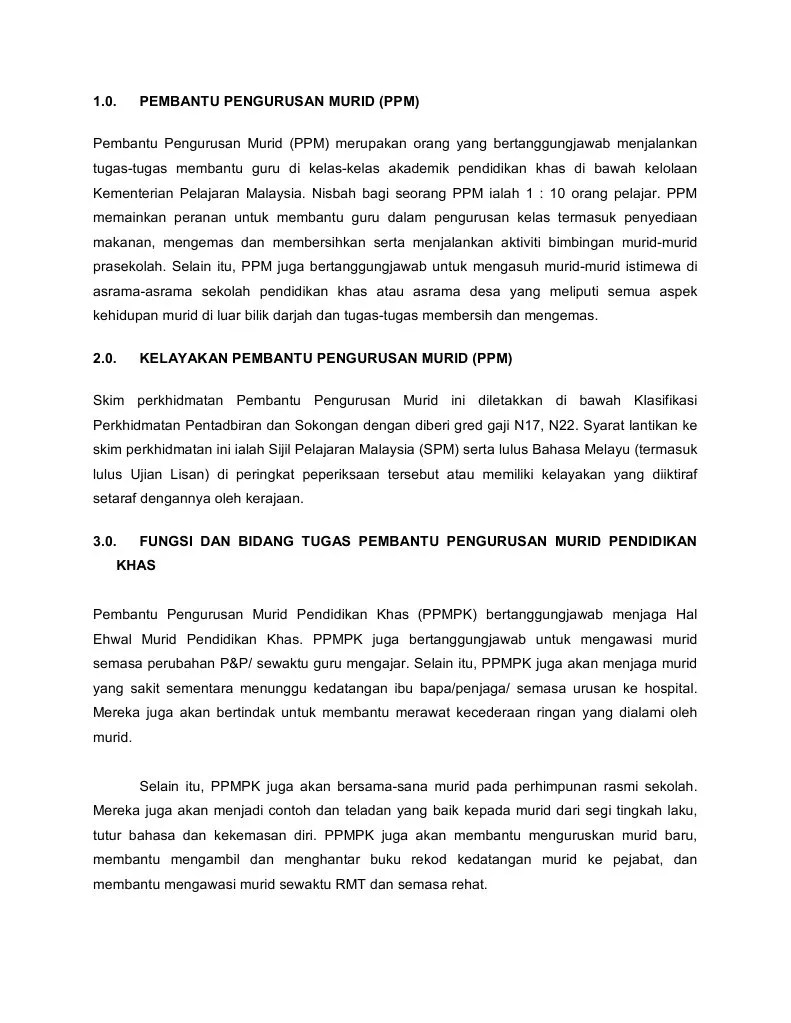 Pembantu pengurusan murid gred n17, n22. Deskripsi tugas maklumat umum gelaran jawatan pembantu pengurusan murid (prasekolah) ketua perkhidmatan ringkasan gelaran jawatan ppm prasekolah kedudukan di . Membantu guru kelas prasekolah dalam hal ehwal pengurusan/pentadbiran kelas 2. Pembantu pengurusan murid gred n19. Skop fungsi dan bidang tugas pembantu pengurusan murid prasekolah a. Modul tugas pembantu pengurusan murid.